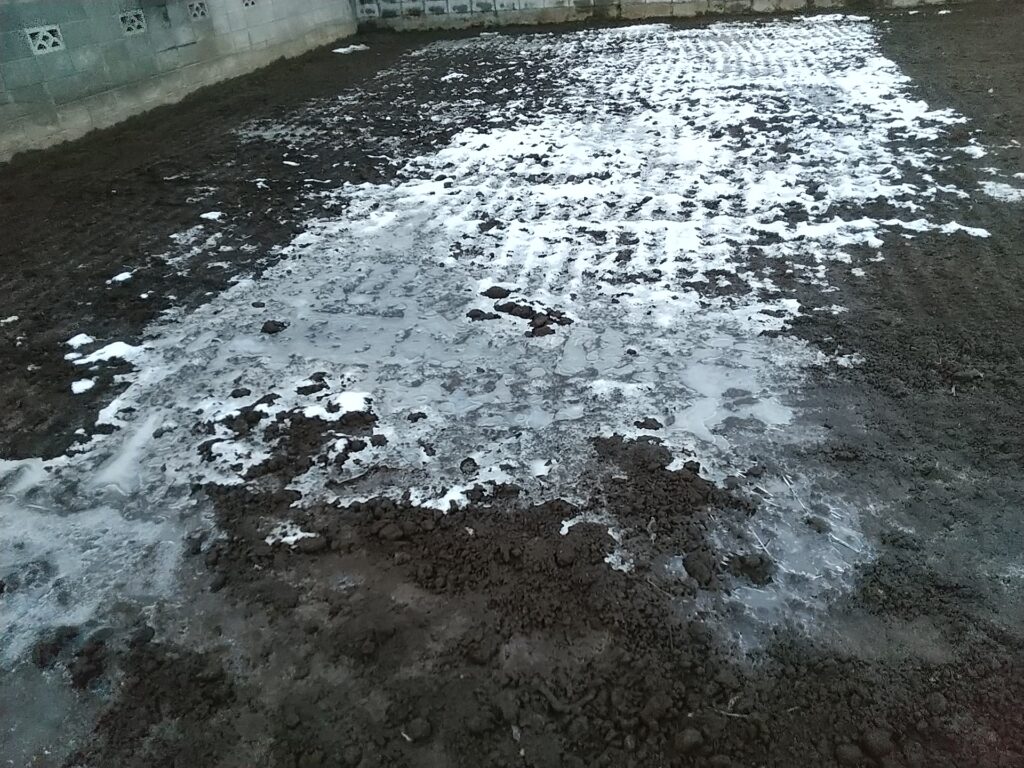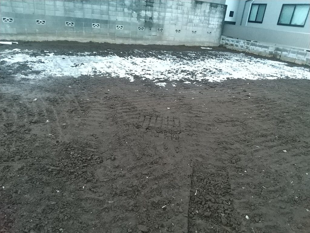 近所の空き地の残雪です。今朝になっても融けてません。